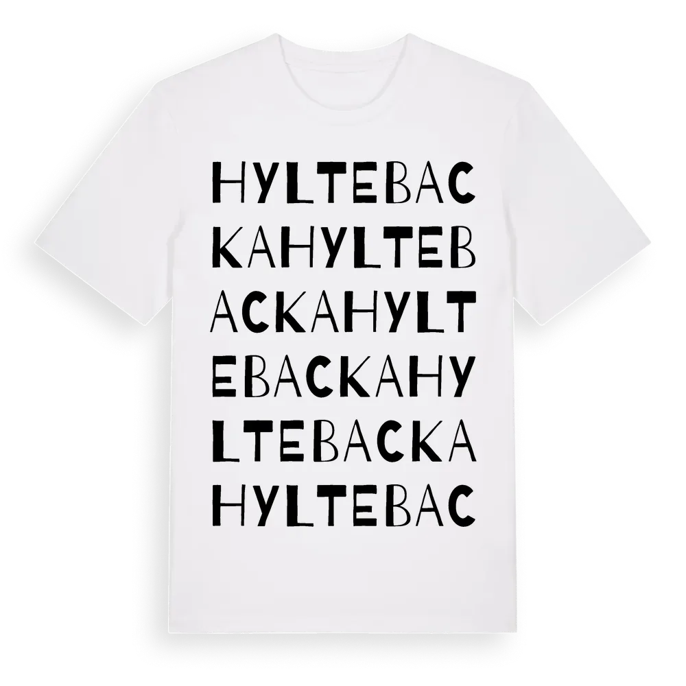 Hyltebacka ordlek t-shirt är inspirerad av Hyltebacka i Västra Götalands län, Sverige. Tröjan är designad för dig som har en speciell koppling till platsen – oavsett om du bor här, har rötterna här eller bara älskar Hyltebacka.