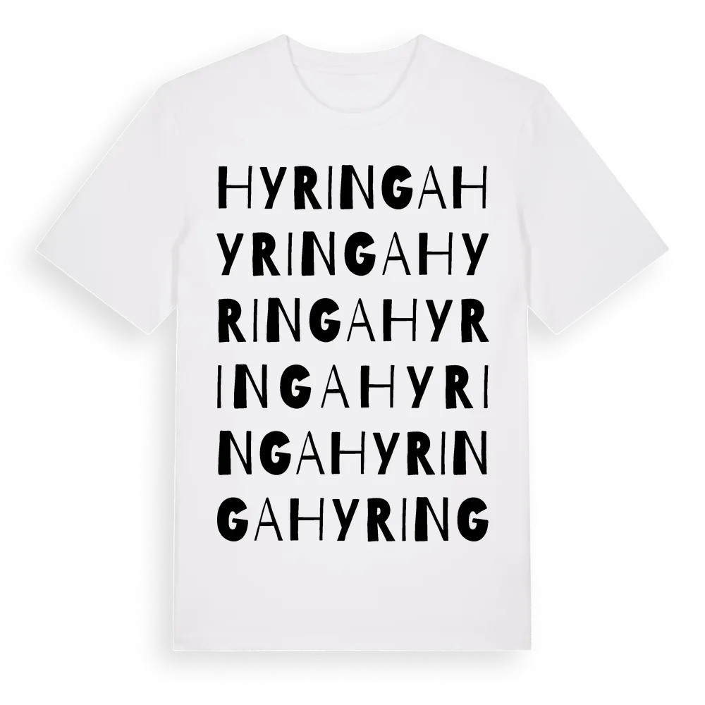 En ordlek byggd på Hyringas namn. Subtilt och klurig – ett motiv som bara de som verkligen känner platsen fullt ut förstår. Premium bomull, unisex – från byn Hyringa i Västra Götalands län.