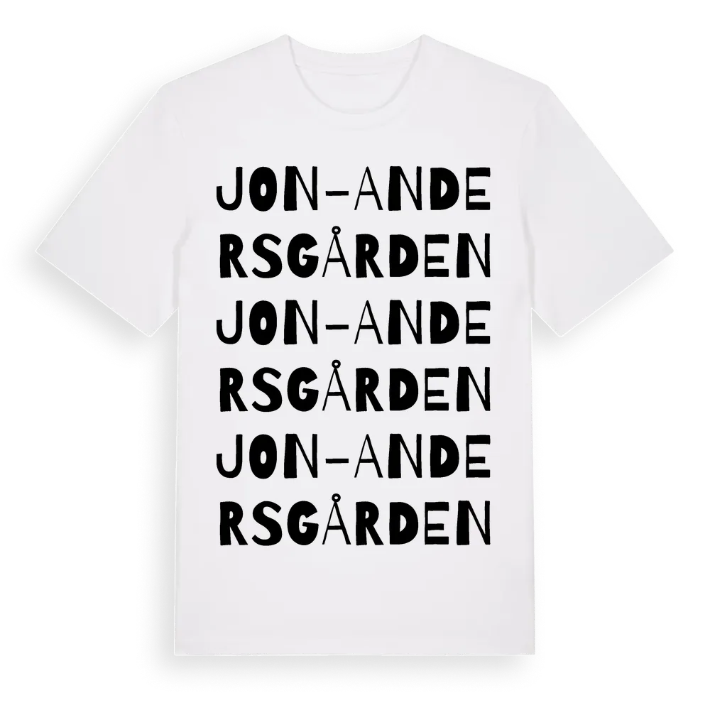 Jon-Andersgården ordlek t-shirt är inspirerad av Jon-Andersgården i Västra Götalands län, Sverige. Tröjan är designad för dig som har en speciell koppling till platsen – oavsett om du bor här, har rötterna här eller bara älskar Jon-Andersgården.