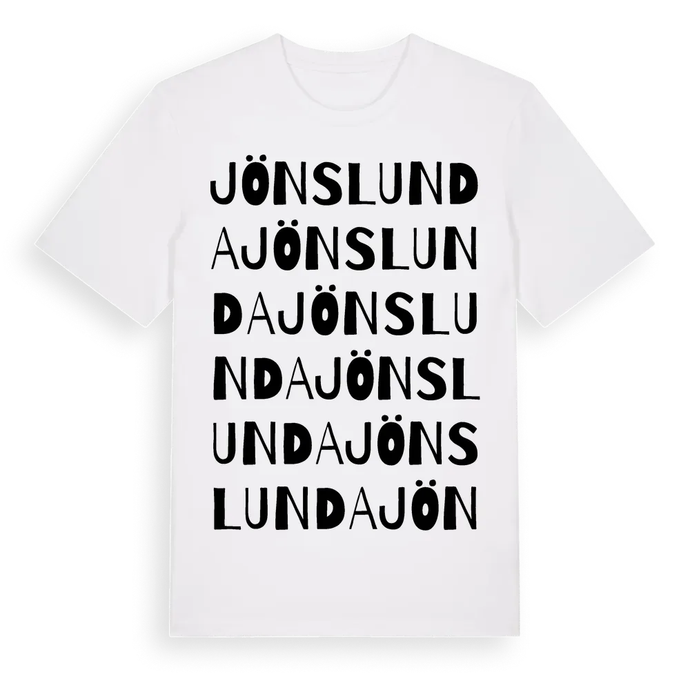 Jönslunda ordlek t-shirt är inspirerad av byn Jönslunda i Västra Götalands län, Sverige. Tröjan är designad för dig som har en speciell koppling till platsen – oavsett om du bor här, har rötterna här eller bara älskar Jönslunda.