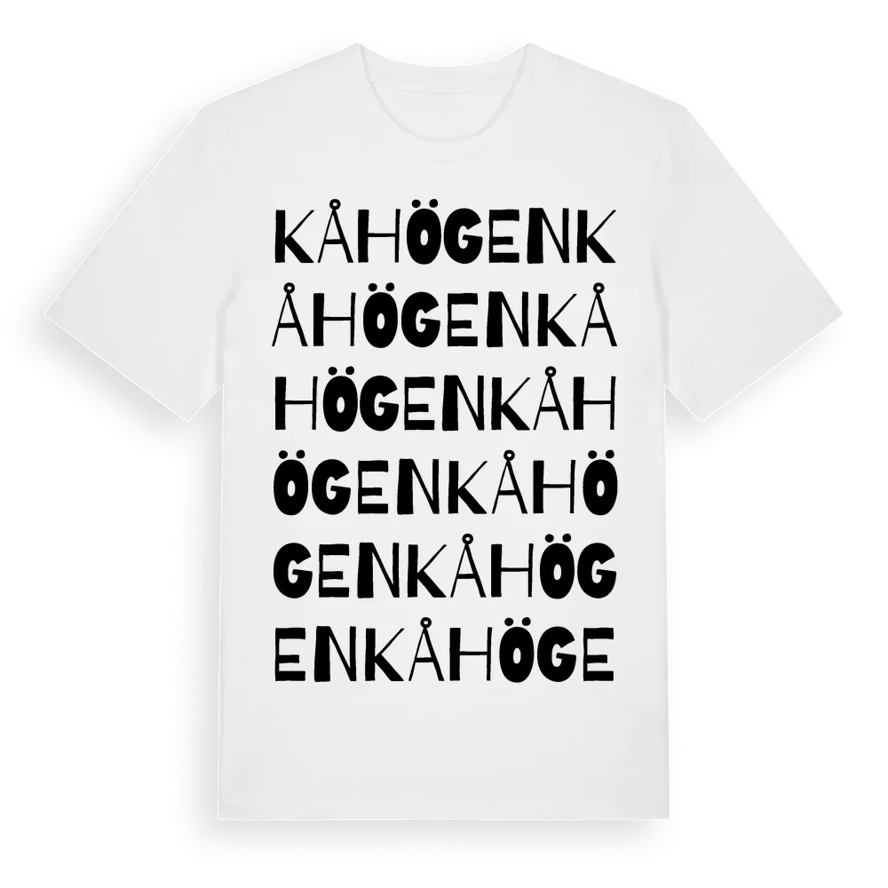 Kåhögen ordlek t-shirt är inspirerad av Kåhögen i Västra Götalands län, Sverige. Tröjan är designad för dig som har en speciell koppling till platsen – oavsett om du bor här, har rötterna här eller bara älskar Kåhögen.