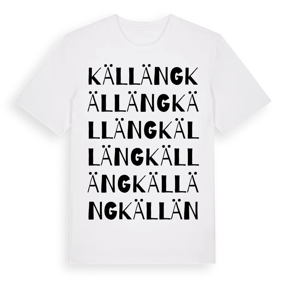 Källäng ordlek t-shirt är inspirerad av Källäng i Västra Götalands län, Sverige. Tröjan är designad för dig som har en speciell koppling till platsen – oavsett om du bor här, har rötterna här eller bara älskar Källäng.