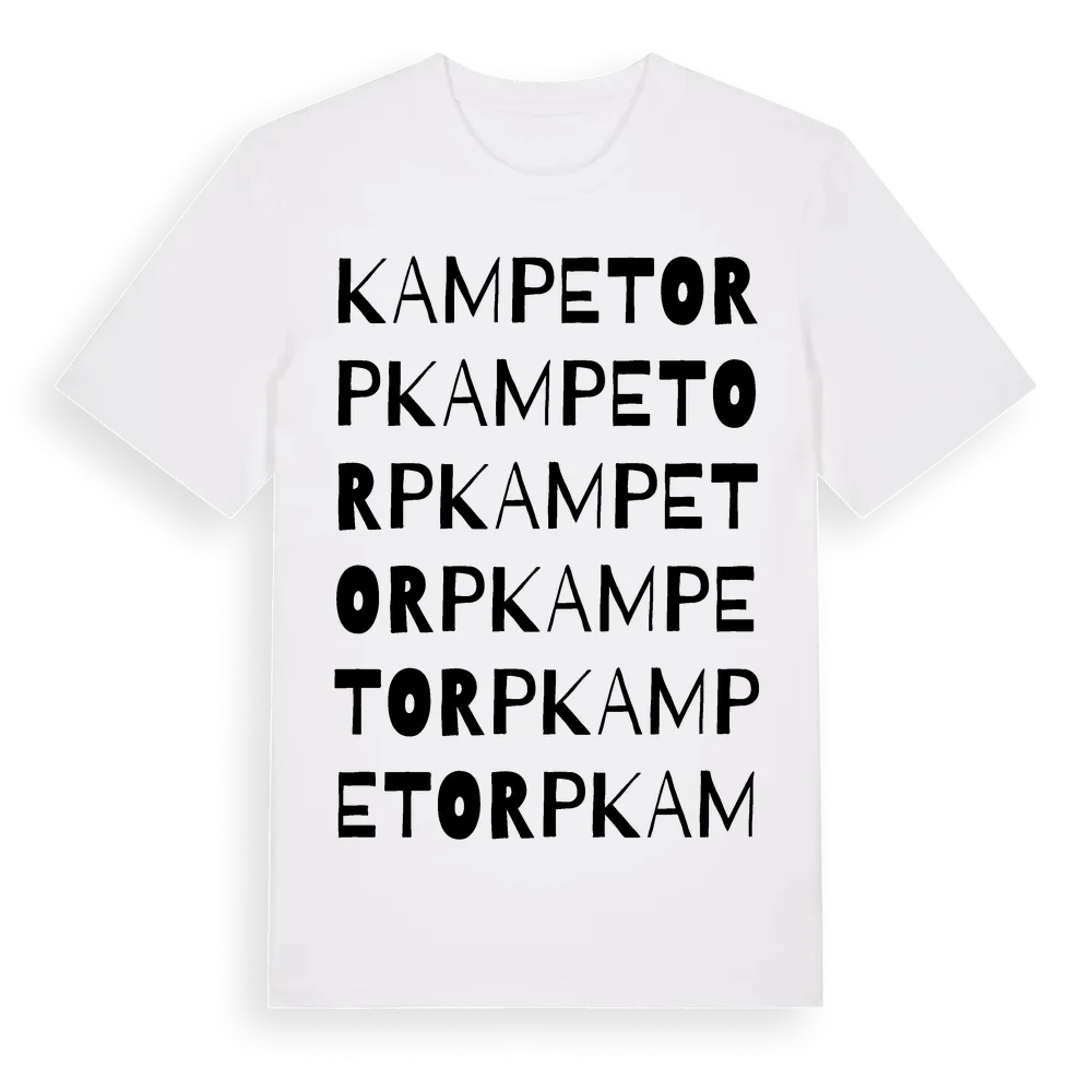 Kampetorp ordlek t-shirt är inspirerad av Kampetorp i Västra Götalands län, Sverige. Tröjan är designad för dig som har en speciell koppling till platsen – oavsett om du bor här, har rötterna här eller bara älskar Kampetorp.