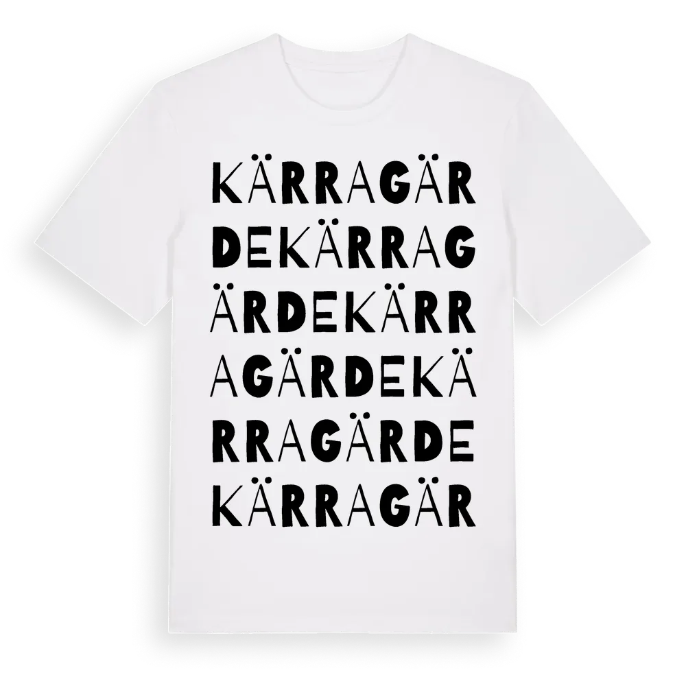 Kärragärde ordlek t-shirt är inspirerad av Kärragärde i Västra Götalands län, Sverige. Tröjan är designad för dig som har en speciell koppling till platsen – oavsett om du bor här, har rötterna här eller bara älskar Kärragärde.