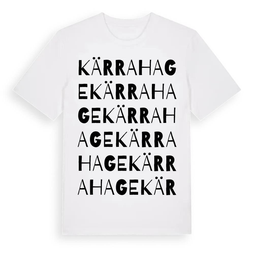 Kärrahage ordlek t-shirt är inspirerad av byn Kärrahage i Västra Götalands län, Sverige. Tröjan är designad för dig som har en speciell koppling till platsen – oavsett om du bor här, har rötterna här eller bara älskar Kärrahage.