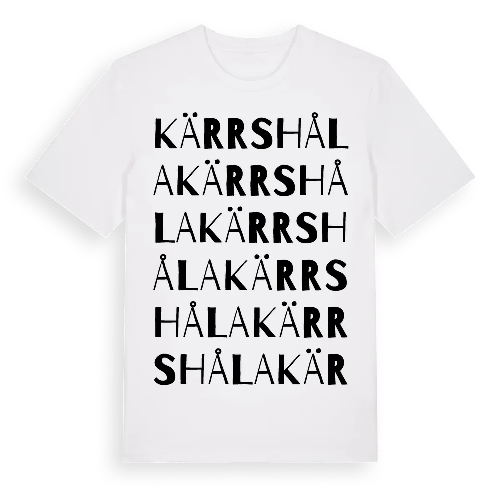 Kärrshåla ordlek t-shirt är inspirerad av Kärrshåla i Västra Götalands län, Sverige. Tröjan är designad för dig som har en speciell koppling till platsen – oavsett om du bor här, har rötterna här eller bara älskar Kärrshåla.