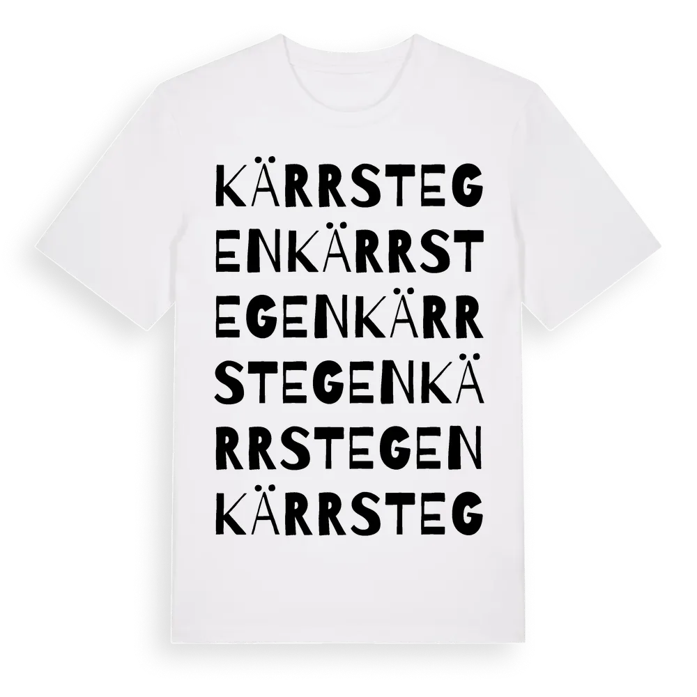 Kärrstegen ordlek t-shirt är inspirerad av Kärrstegen i Västra Götalands län, Sverige. Tröjan är designad för dig som har en speciell koppling till platsen – oavsett om du bor här, har rötterna här eller bara älskar Kärrstegen.