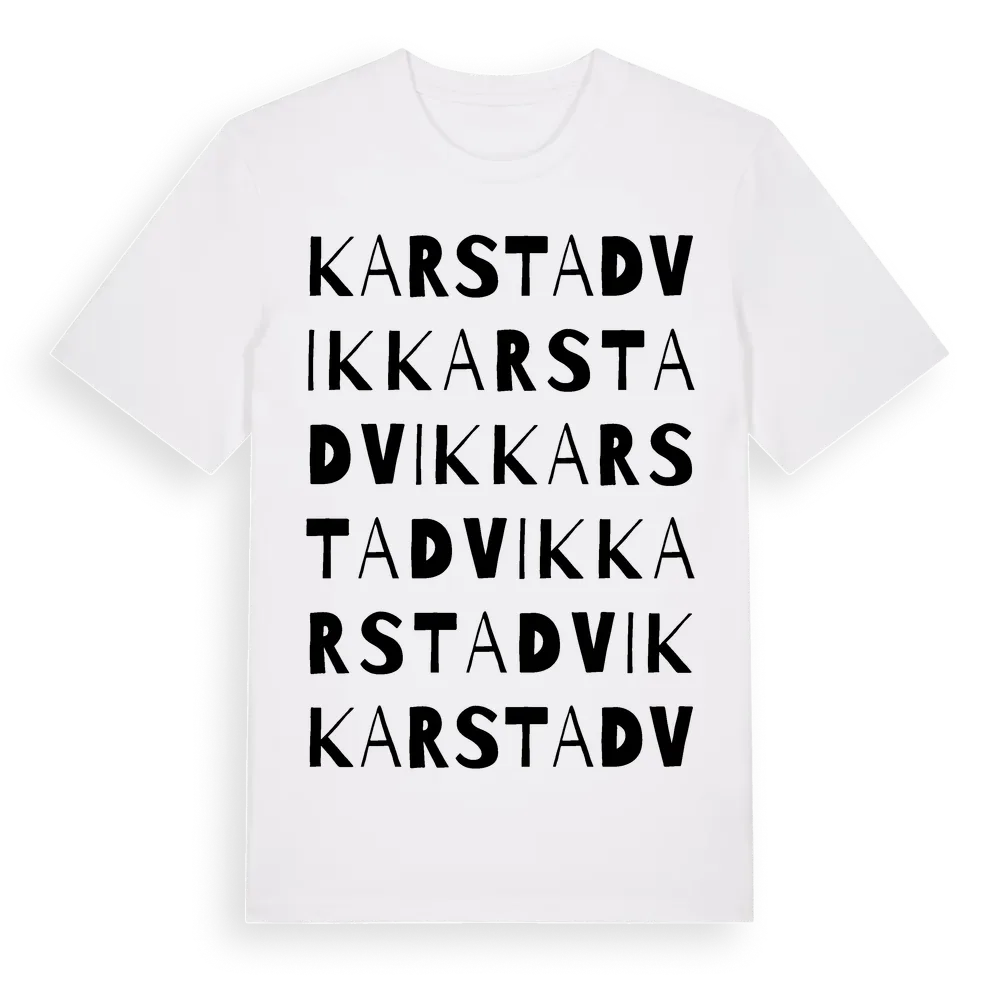 Karstadvik ordlek t-shirt är inspirerad av Karstadvik i Västra Götalands län, Sverige. Tröjan är designad för dig som har en speciell koppling till platsen – oavsett om du bor här, har rötterna här eller bara älskar Karstadvik.