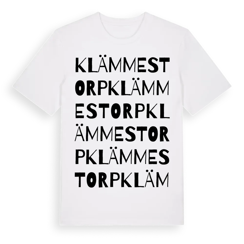 Klämmestorp ordlek t-shirt är inspirerad av Klämmestorp i Västra Götalands län, Sverige. Tröjan är designad för dig som har en speciell koppling till platsen – oavsett om du bor här, har rötterna här eller bara älskar Klämmestorp.