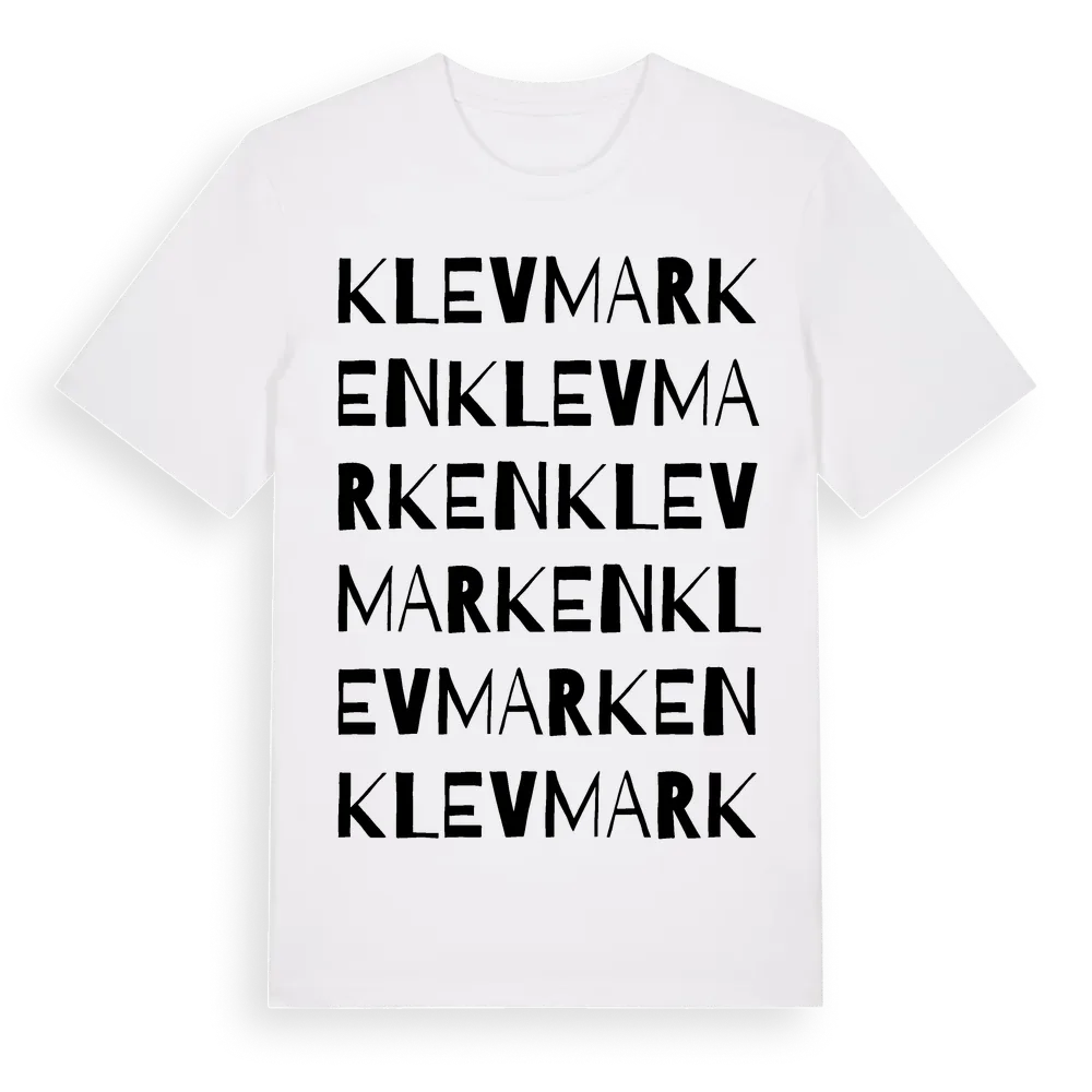 Klevmarken ordlek t-shirt är inspirerad av Klevmarken i Västra Götalands län, Sverige. Tröjan är designad för dig som har en speciell koppling till platsen – oavsett om du bor här, har rötterna här eller bara älskar Klevmarken.
