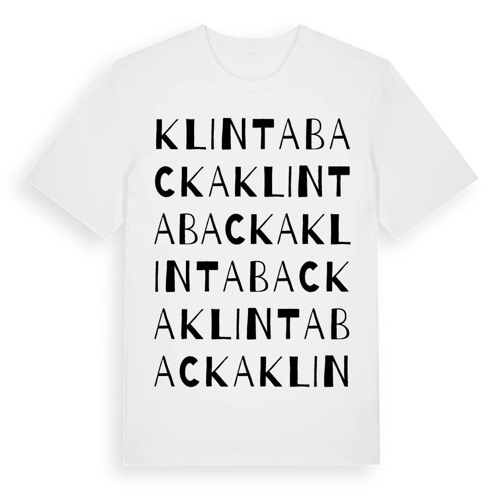 En ordlek byggd på Klintabackas namn. Subtilt och klurig – ett motiv som bara de som verkligen känner platsen fullt ut förstår. Premium bomull, unisex – från Klintabacka i Västra Götalands län.