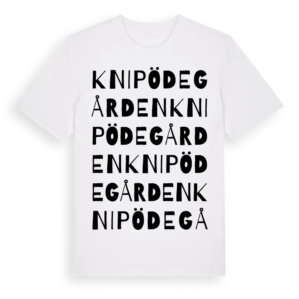 Knipödegården ordlek t-shirt är inspirerad av Knipödegården i Västra Götalands län, Sverige. Tröjan är designad för dig som har en speciell koppling till platsen – oavsett om du bor här, har rötterna här eller bara älskar Knipödegården.