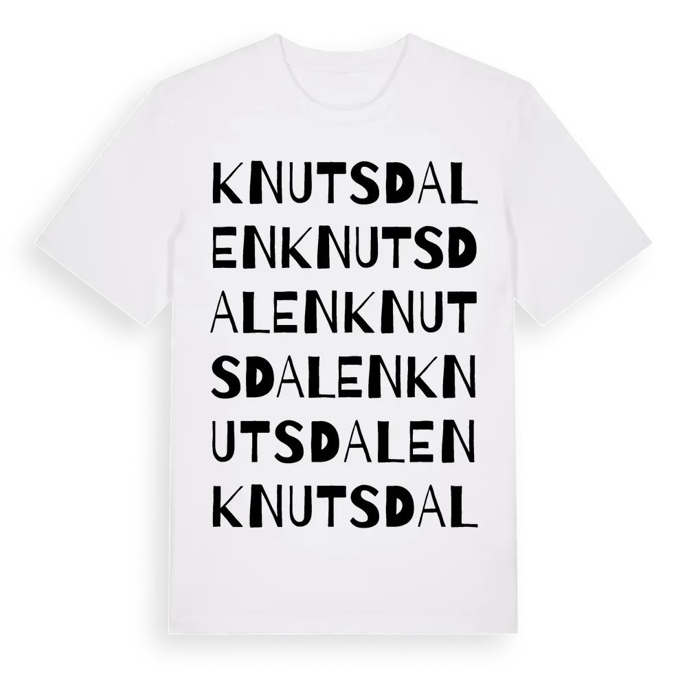 Knutsdalen ordlek t-shirt är inspirerad av byn Knutsdalen i Västra Götalands län, Sverige. Tröjan är designad för dig som har en speciell koppling till platsen – oavsett om du bor här, har rötterna här eller bara älskar Knutsdalen.