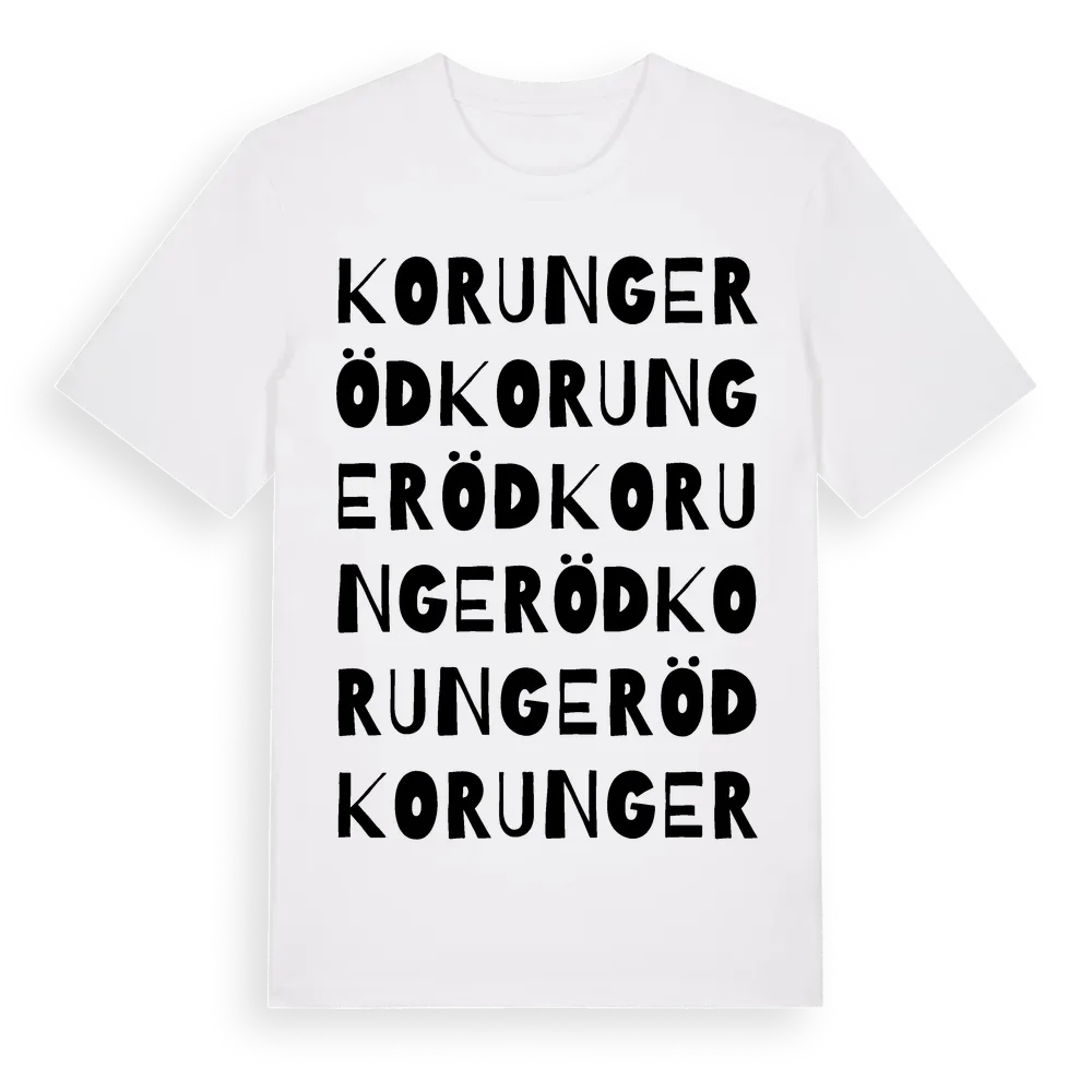 Korungeröd ordlek t-shirt är inspirerad av byn Korungeröd i Västra Götalands län, Sverige. Tröjan är designad för dig som har en speciell koppling till platsen – oavsett om du bor här, har rötterna här eller bara älskar Korungeröd.