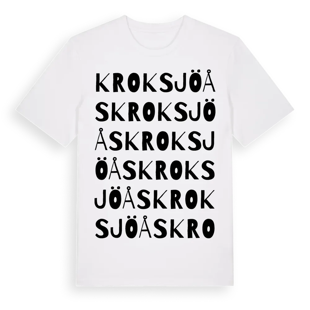 Kroksjöås ordlek t-shirt är inspirerad av Kroksjöås i Västra Götalands län, Sverige. Tröjan är designad för dig som har en speciell koppling till platsen – oavsett om du bor här, har rötterna här eller bara älskar Kroksjöås.