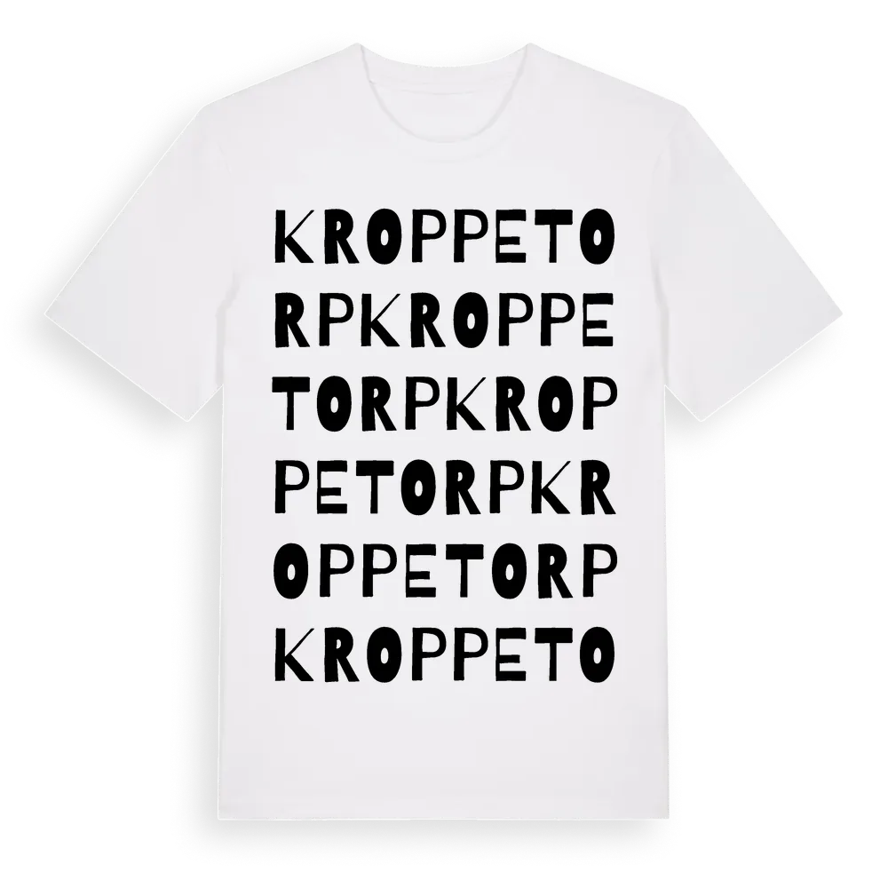 Kroppetorp ordlek t-shirt är inspirerad av byn Kroppetorp i Västra Götalands län, Sverige. Tröjan är designad för dig som har en speciell koppling till platsen – oavsett om du bor här, har rötterna här eller bara älskar Kroppetorp.