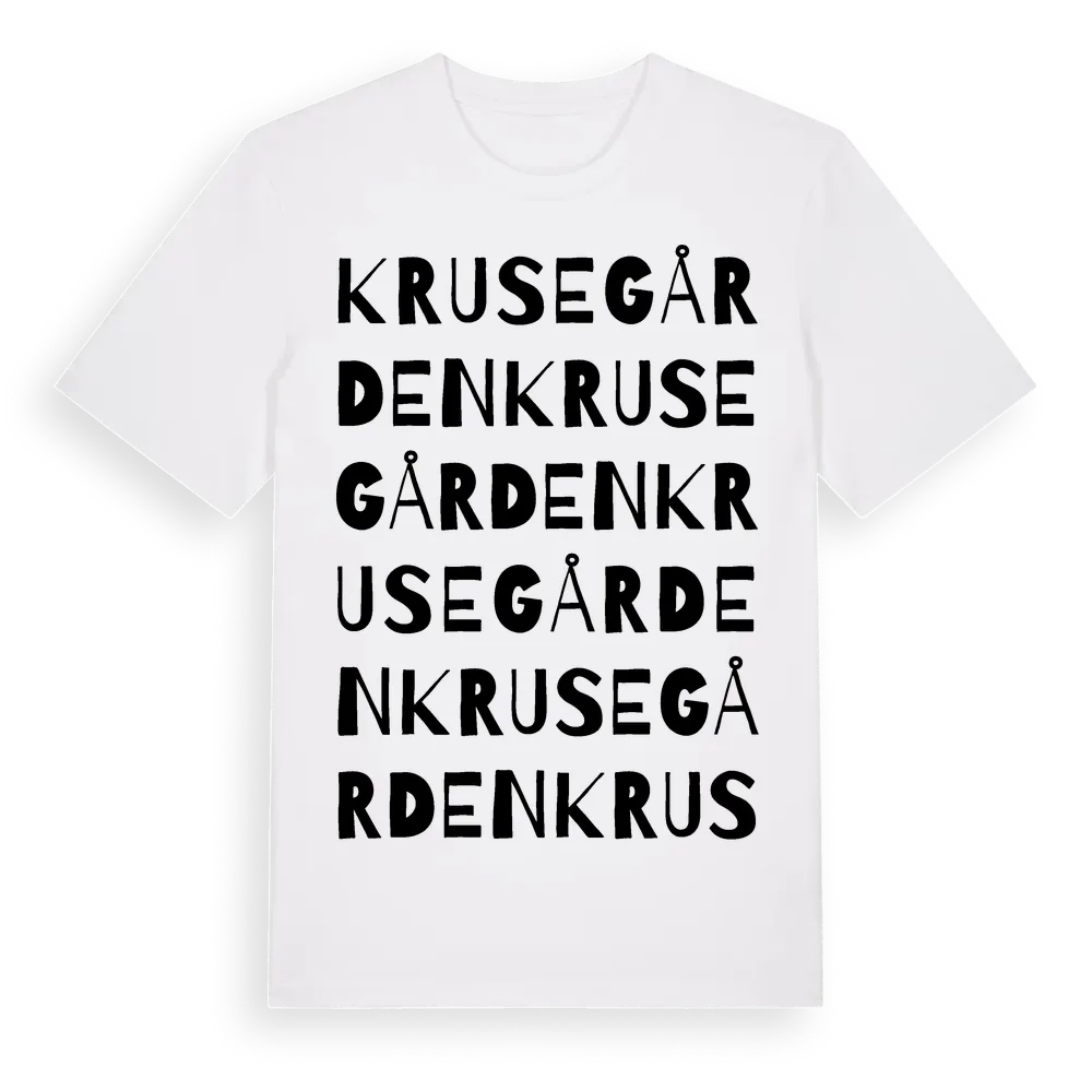 Krusegården ordlek t-shirt är inspirerad av Krusegården i Västra Götalands län, Sverige. Tröjan är designad för dig som har en speciell koppling till platsen – oavsett om du bor här, har rötterna här eller bara älskar Krusegården.