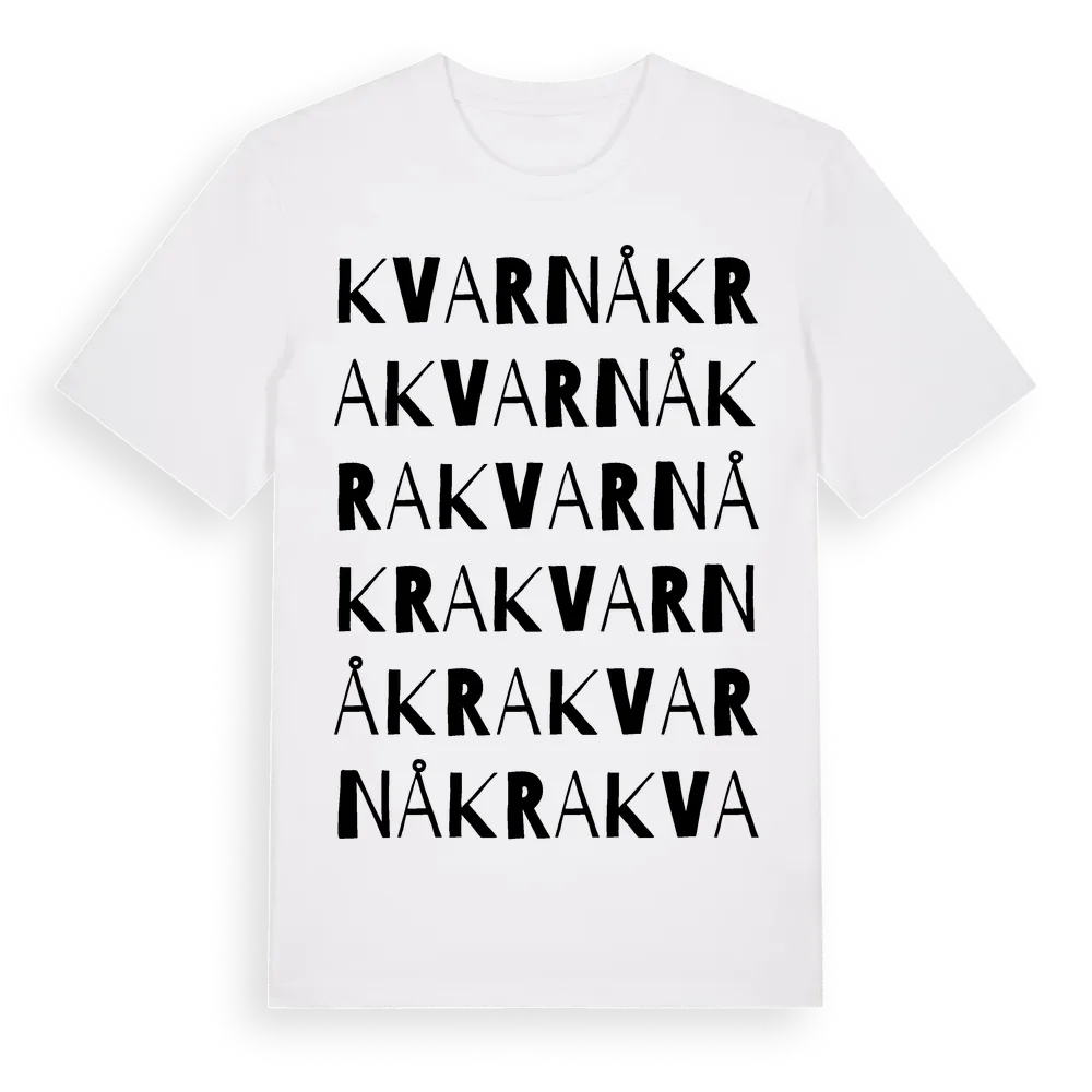 Kvarnåkra ordlek t-shirt är inspirerad av Kvarnåkra i Västra Götalands län, Sverige. Tröjan är designad för dig som har en speciell koppling till platsen – oavsett om du bor här, har rötterna här eller bara älskar Kvarnåkra.