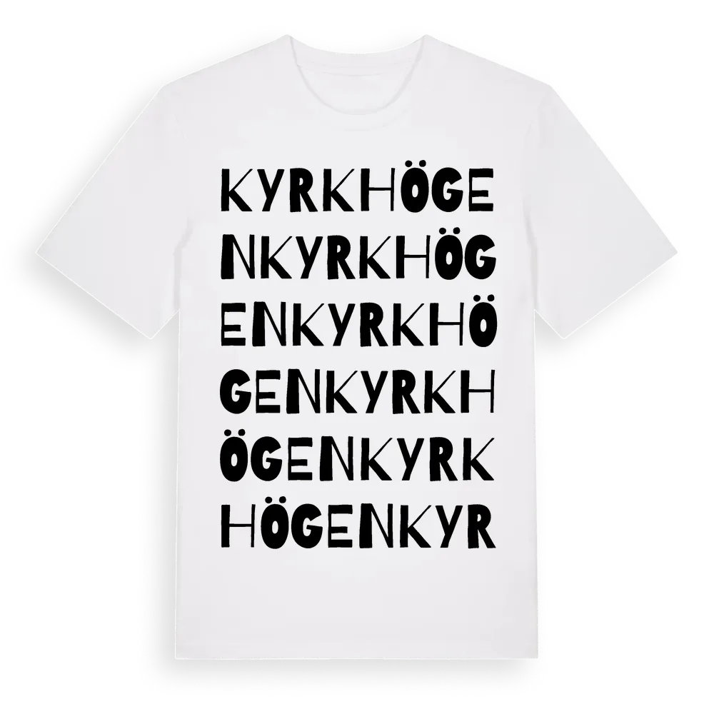 Kyrkhögen ordlek t-shirt är inspirerad av Kyrkhögen i Västra Götalands län, Sverige. Tröjan är designad för dig som har en speciell koppling till platsen – oavsett om du bor här, har rötterna här eller bara älskar Kyrkhögen.