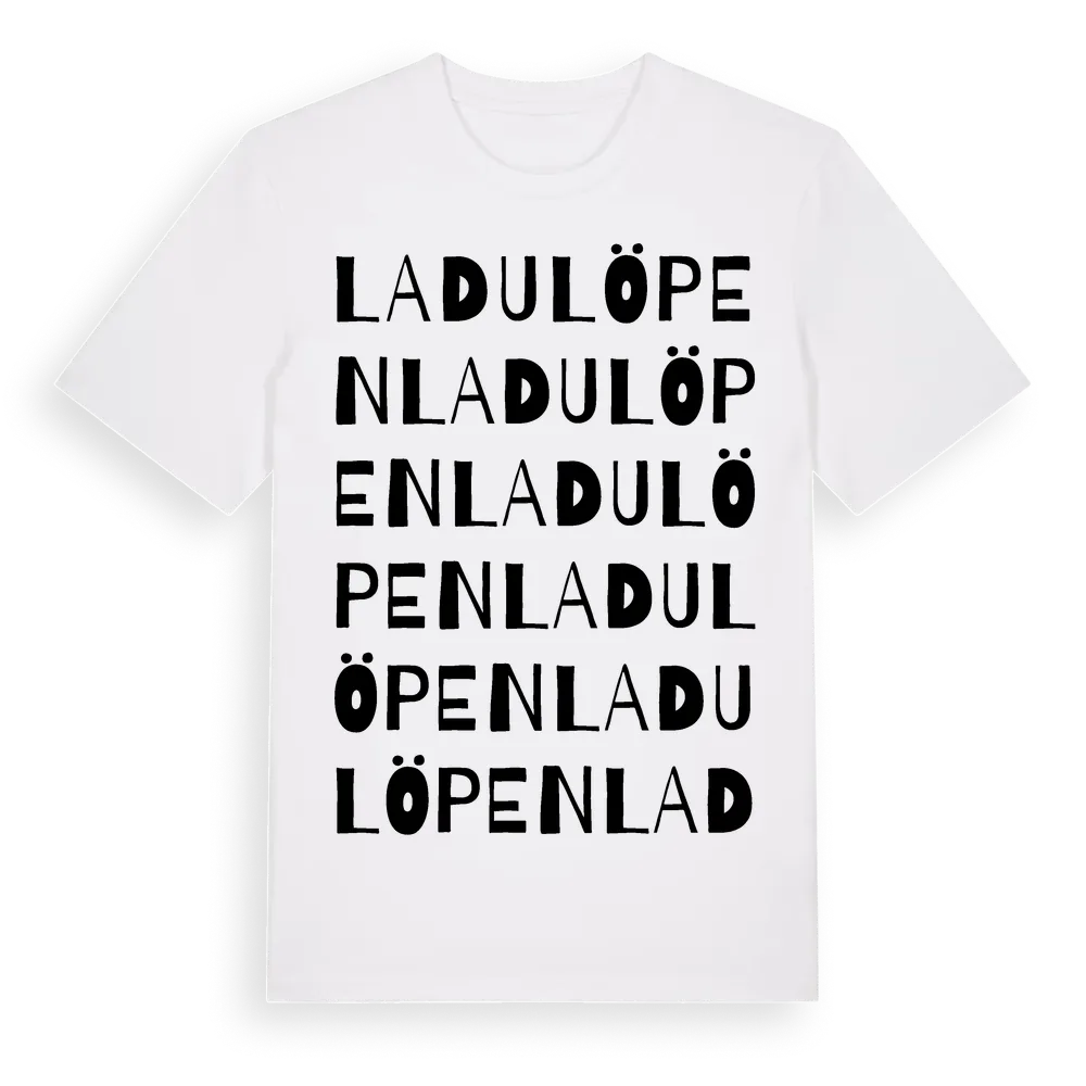 En ordlek byggd på Ladulöpens namn. Subtilt och klurig – ett motiv som bara de som verkligen känner platsen fullt ut förstår. Premium bomull, unisex – från Ladulöpen i Västra Götalands län.