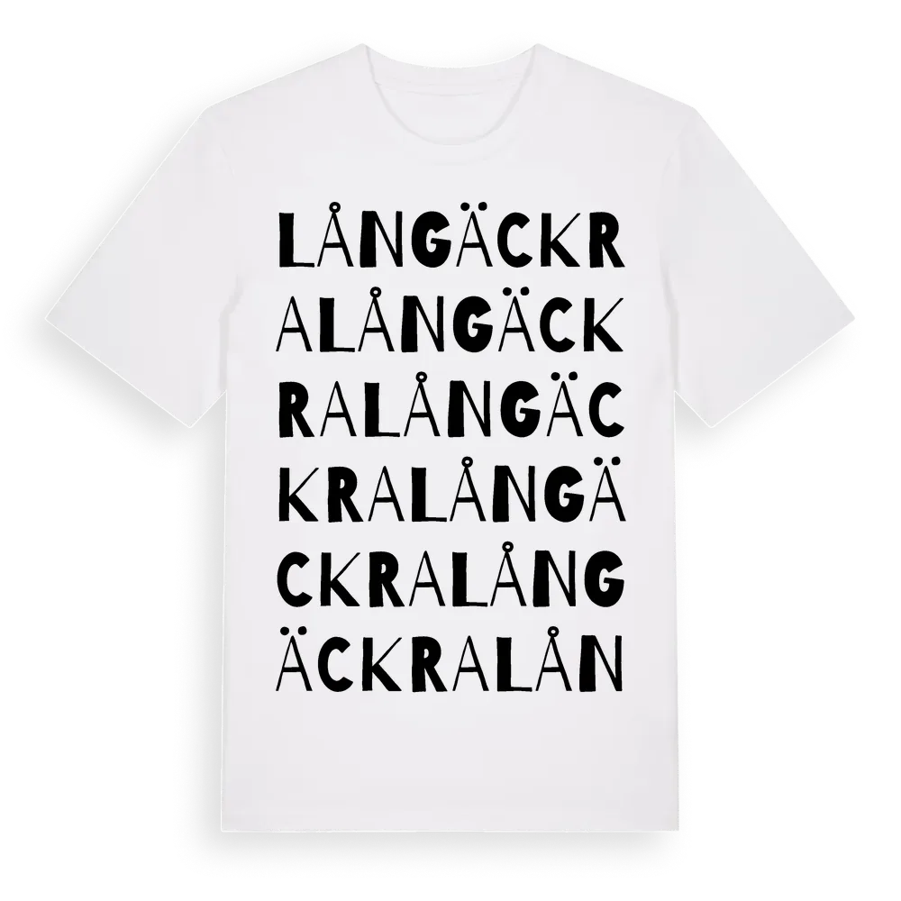 Långäckra ordlek t-shirt är inspirerad av byn Långäckra i Västra Götalands län, Sverige. Tröjan är designad för dig som har en speciell koppling till platsen – oavsett om du bor här, har rötterna här eller bara älskar Långäckra.