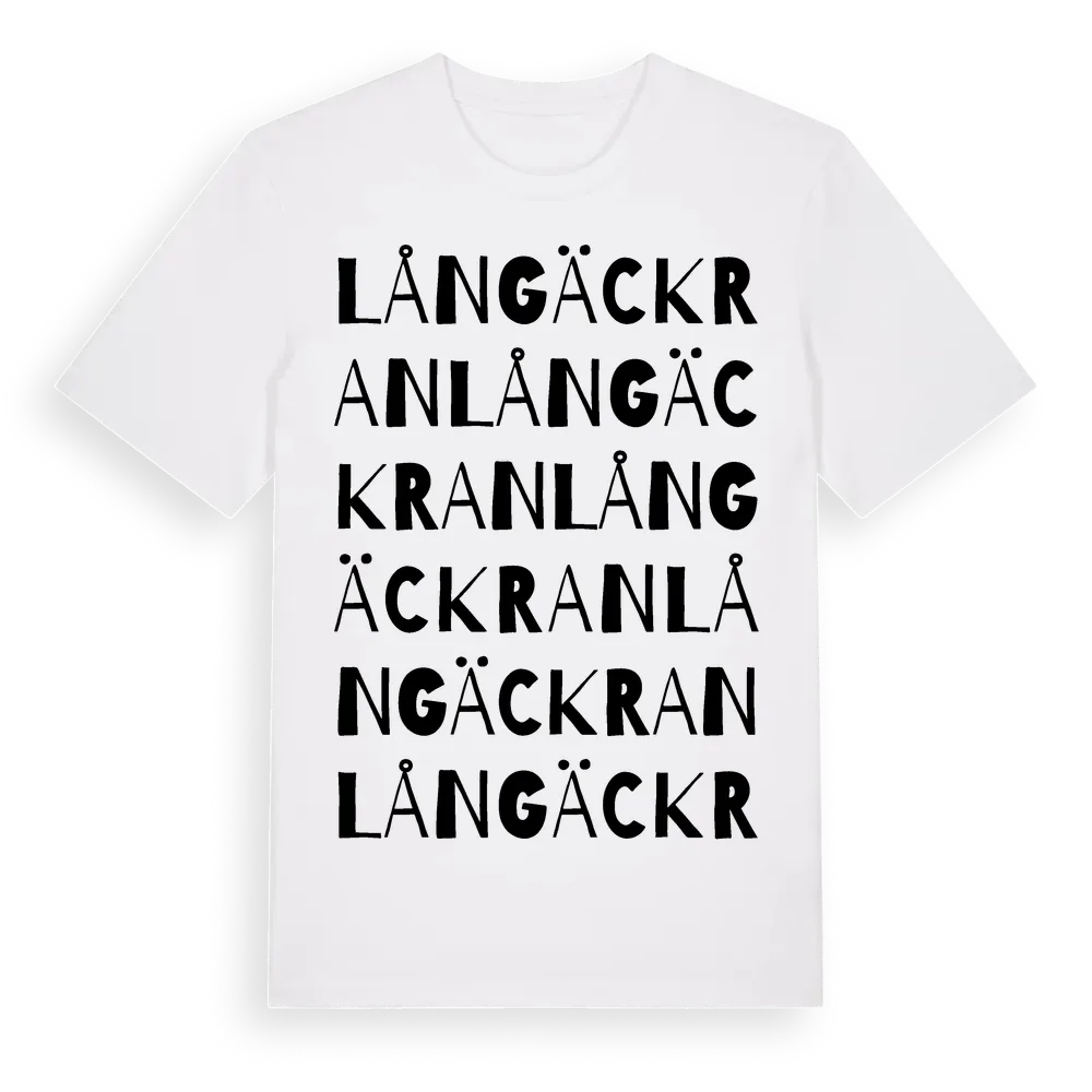 Långäckran ordlek t-shirt är inspirerad av Långäckran i Västra Götalands län, Sverige. Tröjan är designad för dig som har en speciell koppling till platsen – oavsett om du bor här, har rötterna här eller bara älskar Långäckran.