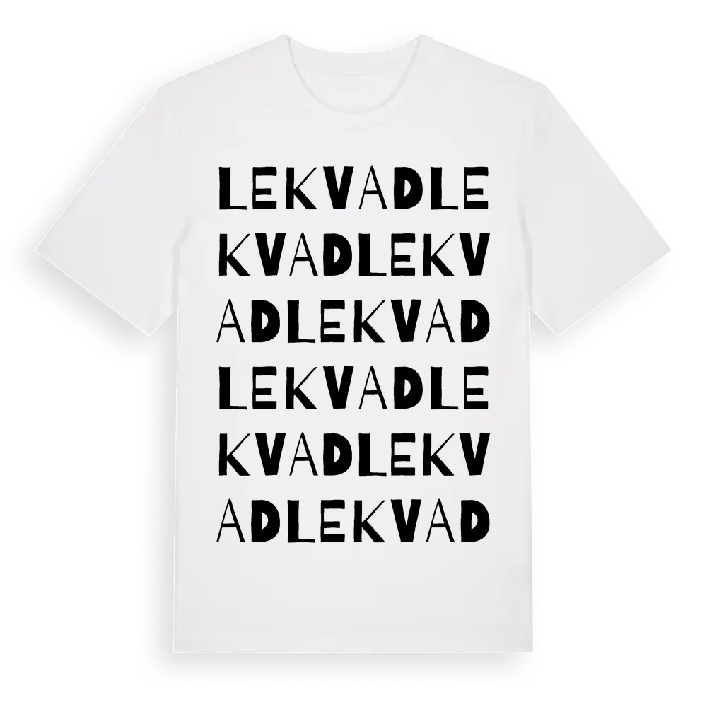 Lekvad ordlek t-shirt är inspirerad av byn Lekvad i Västra Götalands län, Sverige. Tröjan är designad för dig som har en speciell koppling till platsen – oavsett om du bor här, har rötterna här eller bara älskar Lekvad.
