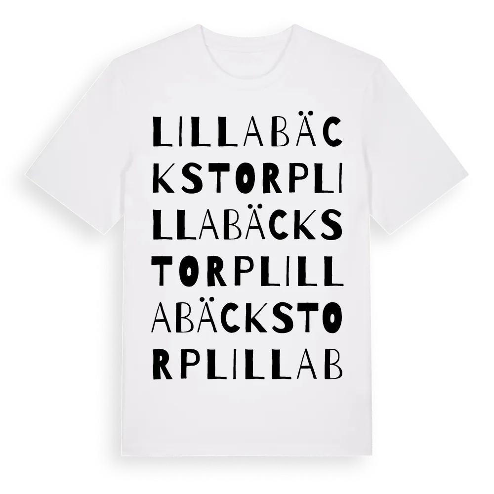 Lilla Bäckstorp ordlek t-shirt är inspirerad av byn Lilla Bäckstorp i Västra Götalands län, Sverige. Tröjan är designad för dig som har en speciell koppling till platsen – oavsett om du bor här, har rötterna här eller bara älskar Lilla Bäckstorp.