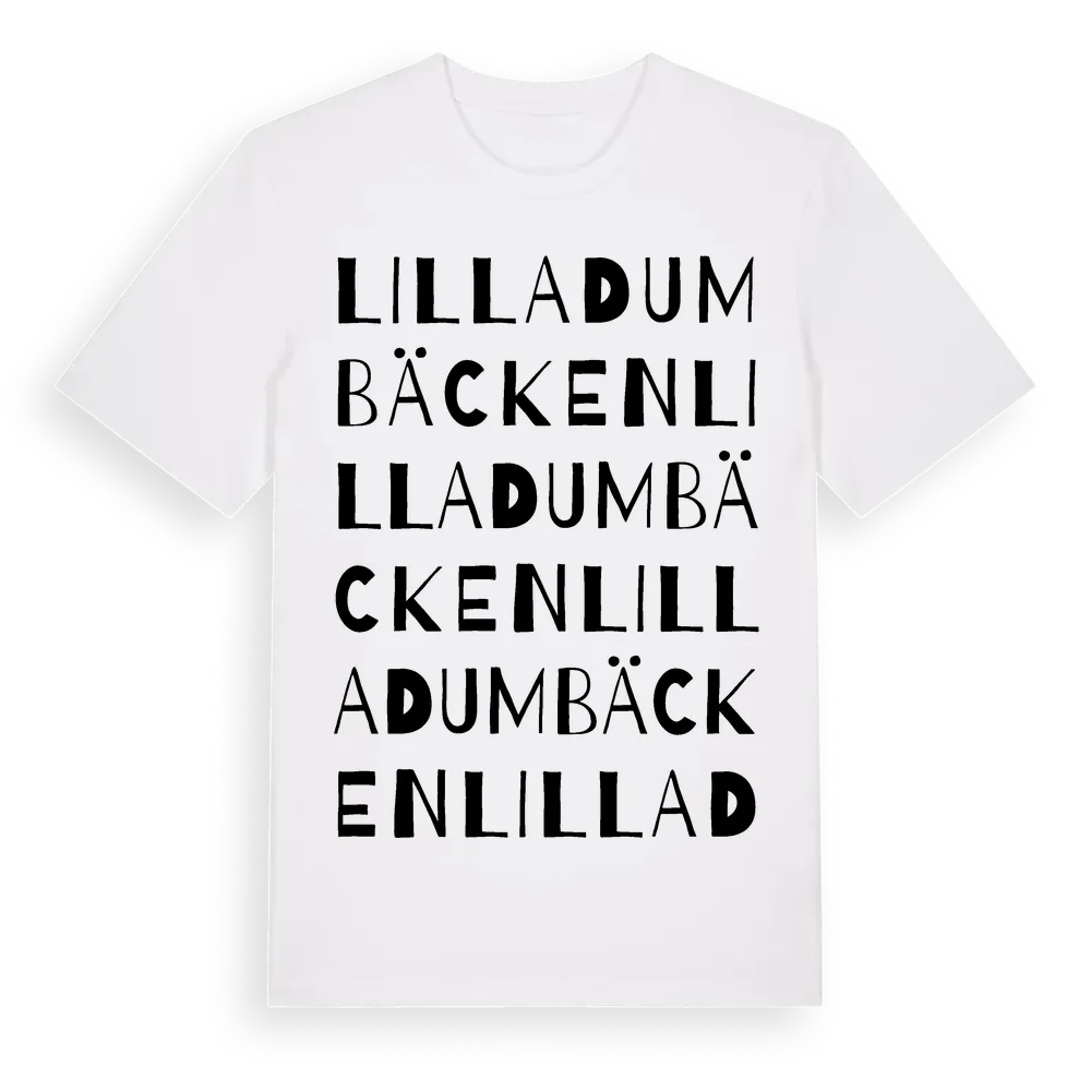 Lilla Dumbäcken ordlek t-shirt är inspirerad av Lilla Dumbäcken i Västra Götalands län, Sverige. Tröjan är designad för dig som har en speciell koppling till platsen – oavsett om du bor här, har rötterna här eller bara älskar Lilla Dumbäcken.