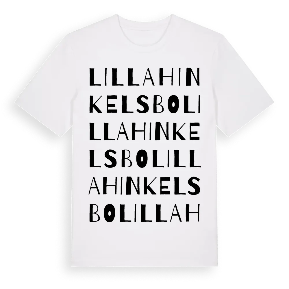Lilla Hinkelsbo ordlek t-shirt är inspirerad av byn Lilla Hinkelsbo i Västra Götalands län, Sverige. Tröjan är designad för dig som har en speciell koppling till platsen – oavsett om du bor här, har rötterna här eller bara älskar Lilla Hinkelsbo.