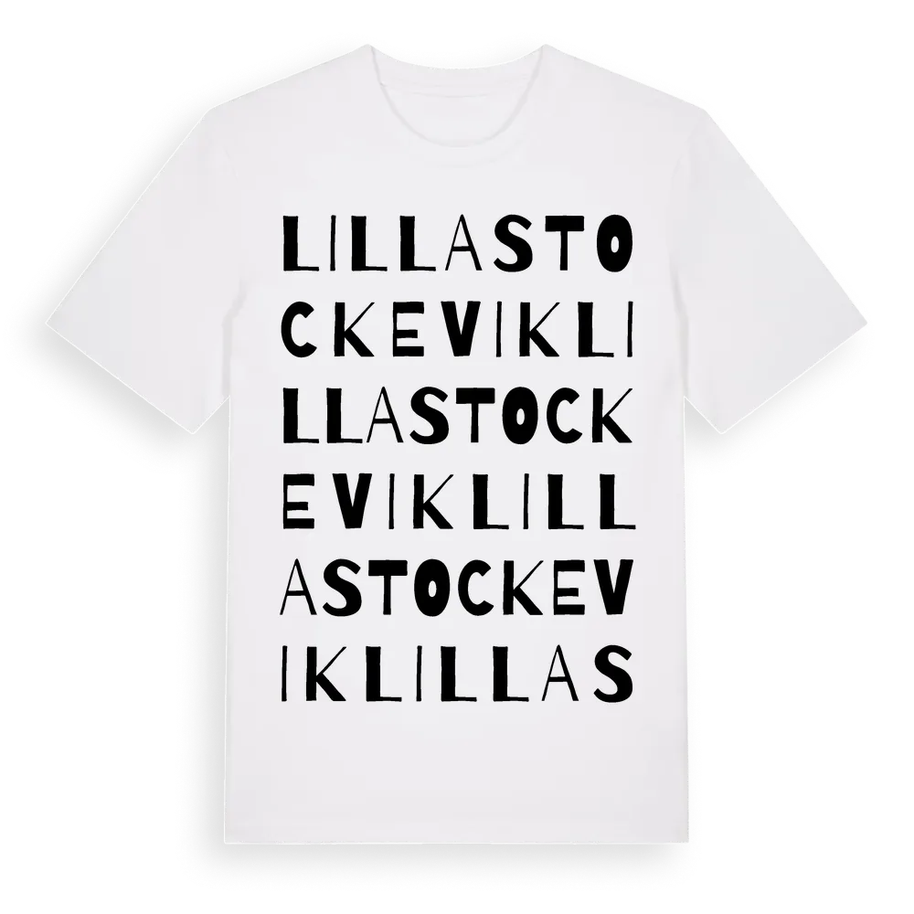 Lilla Stockevik ordlek t-shirt är inspirerad av Lilla Stockevik i Västra Götalands län, Sverige. Tröjan är designad för dig som har en speciell koppling till platsen – oavsett om du bor här, har rötterna här eller bara älskar Lilla Stockevik.