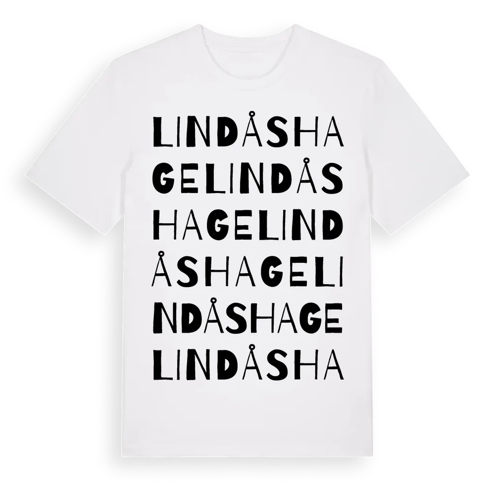 Lindåshage ordlek t-shirt är inspirerad av byn Lindåshage i Västra Götalands län, Sverige. Tröjan är designad för dig som har en speciell koppling till platsen – oavsett om du bor här, har rötterna här eller bara älskar Lindåshage.