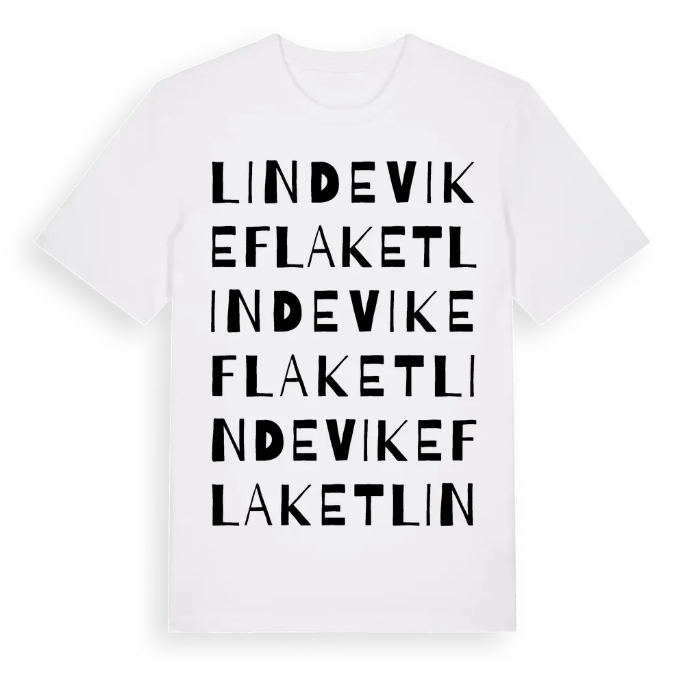 Lindevikeflaket ordlek t-shirt är inspirerad av Lindevikeflaket i Västra Götalands län, Sverige. Tröjan är designad för dig som har en speciell koppling till platsen – oavsett om du bor här, har rötterna här eller bara älskar Lindevikeflaket.