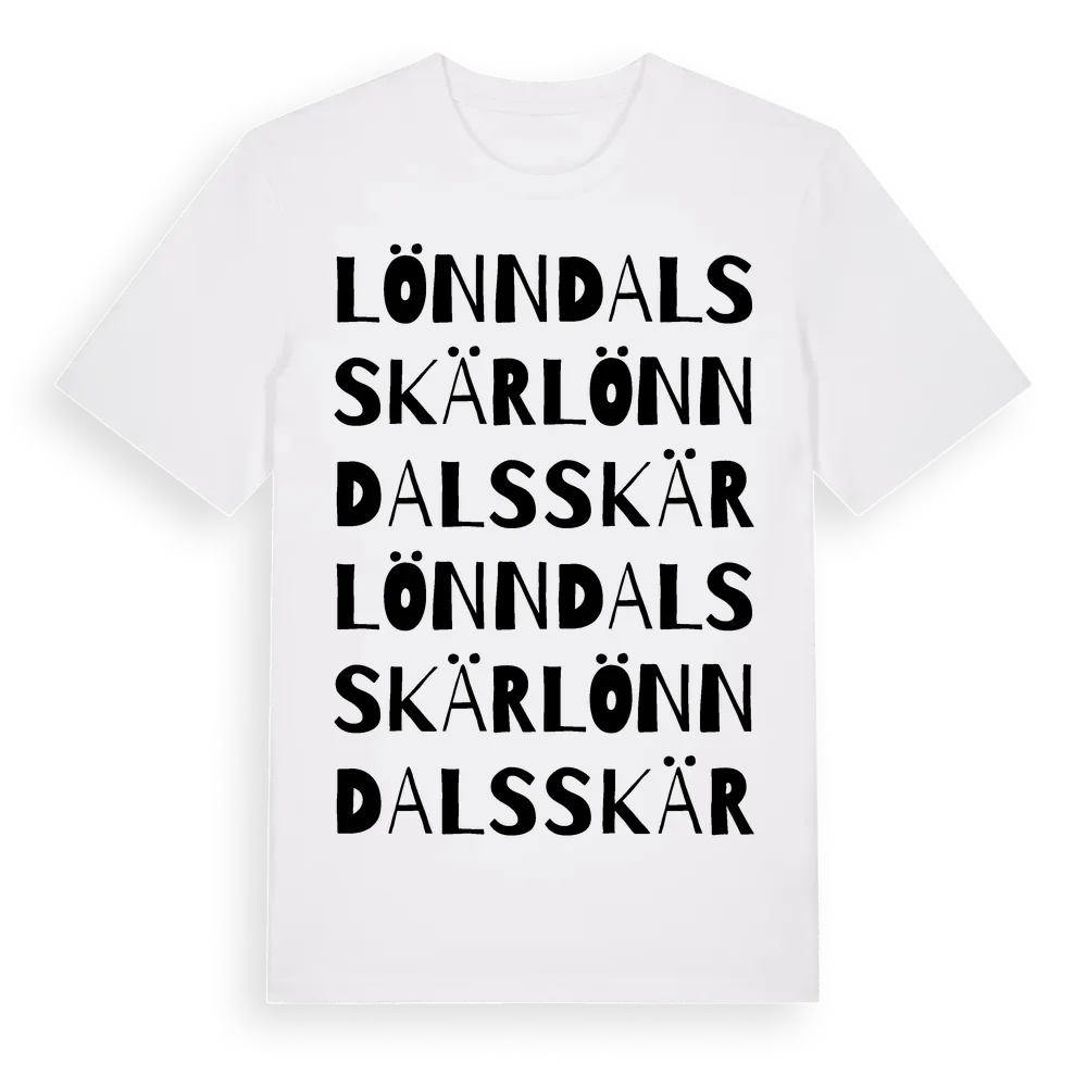 Lönndalsskär ordlek t-shirt är inspirerad av Lönndalsskär i Västra Götalands län, Sverige. Tröjan är designad för dig som har en speciell koppling till platsen – oavsett om du bor här, har rötterna här eller bara älskar Lönndalsskär.
