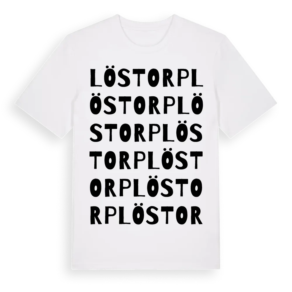 Löstorp ordlek t-shirt är inspirerad av byn Löstorp i Västra Götalands län, Sverige. Tröjan är designad för dig som har en speciell koppling till platsen – oavsett om du bor här, har rötterna här eller bara älskar Löstorp.