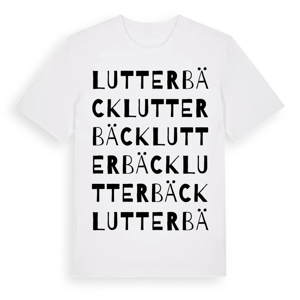 Lutterbäck ordlek t-shirt är inspirerad av Lutterbäck i Västra Götalands län, Sverige. Tröjan är designad för dig som har en speciell koppling till platsen – oavsett om du bor här, har rötterna här eller bara älskar Lutterbäck.
