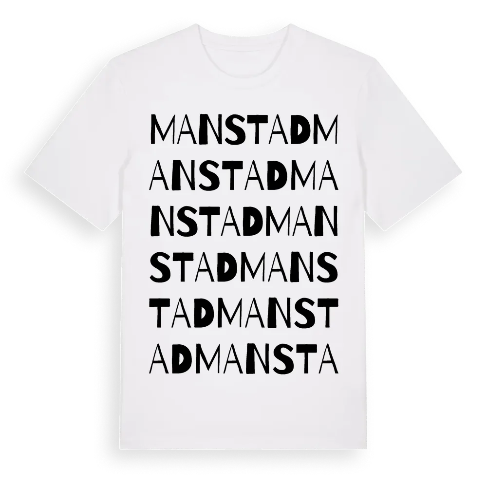 Manstad ordlek t-shirt är inspirerad av byn Manstad i Västra Götalands län, Sverige. Tröjan är designad för dig som har en speciell koppling till platsen – oavsett om du bor här, har rötterna här eller bara älskar Manstad.