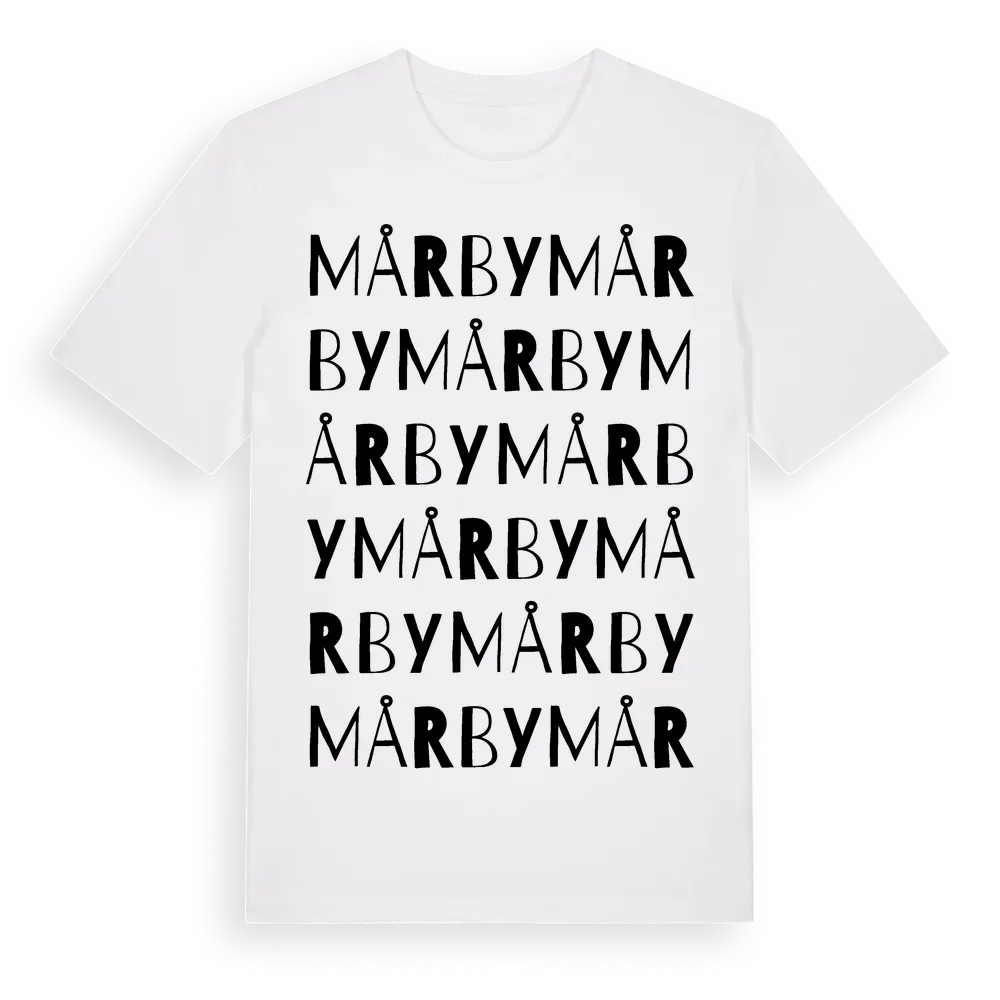 Mårby ordlek t-shirt är inspirerad av byn Mårby i Västra Götalands län, Sverige. Tröjan är designad för dig som har en speciell koppling till platsen – oavsett om du bor här, har rötterna här eller bara älskar Mårby.