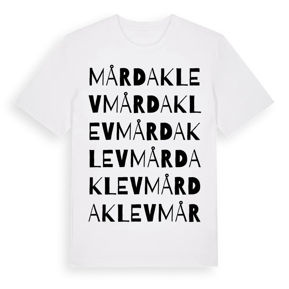 Mårdaklev ordlek t-shirt är inspirerad av byn Mårdaklev i Västra Götalands län, Sverige. Tröjan är designad för dig som har en speciell koppling till platsen – oavsett om du bor här, har rötterna här eller bara älskar Mårdaklev.