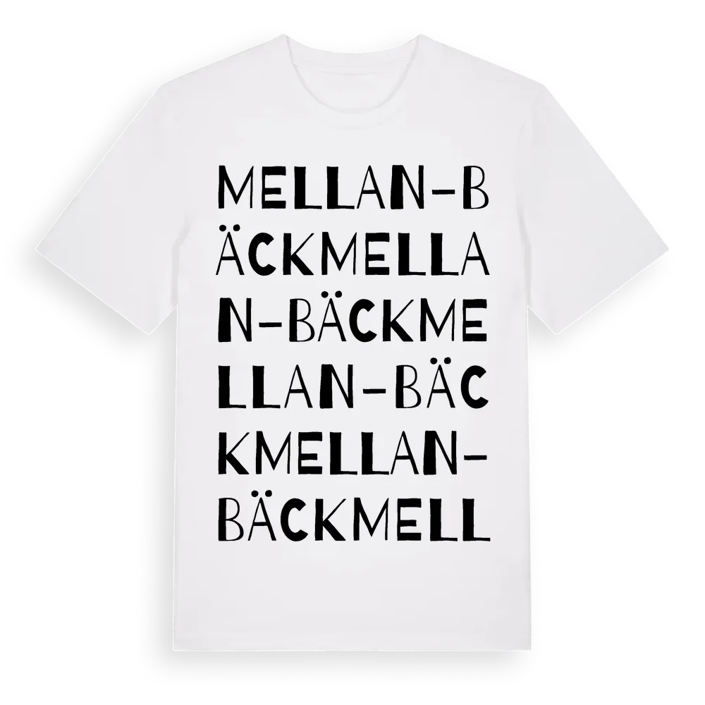 Mellan-Bäck ordlek t-shirt är inspirerad av Mellan-Bäck i Västra Götalands län, Sverige. Tröjan är designad för dig som har en speciell koppling till platsen – oavsett om du bor här, har rötterna här eller bara älskar Mellan-Bäck.