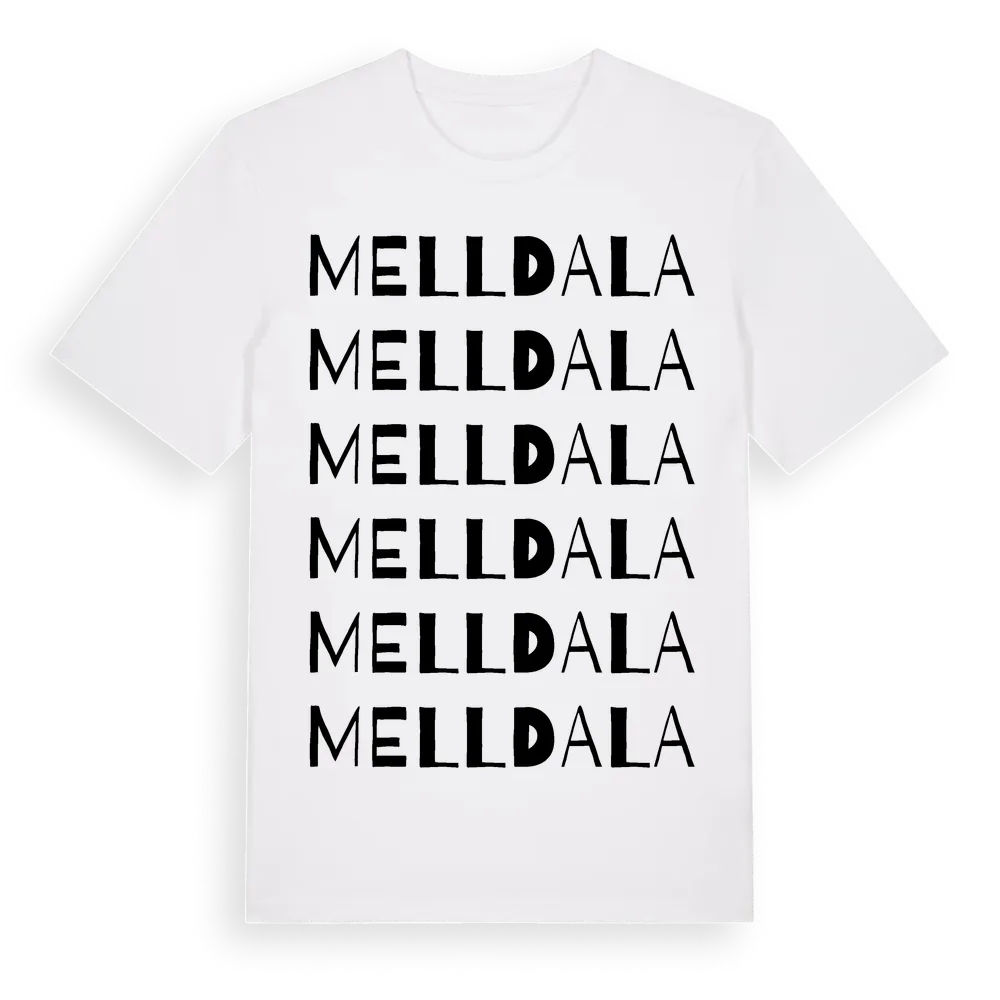 En ordlek byggd på Melldalas namn. Subtilt och klurig – ett motiv som bara de som verkligen känner platsen fullt ut förstår. Premium bomull, unisex – från byn Melldala i Västra Götalands län.
