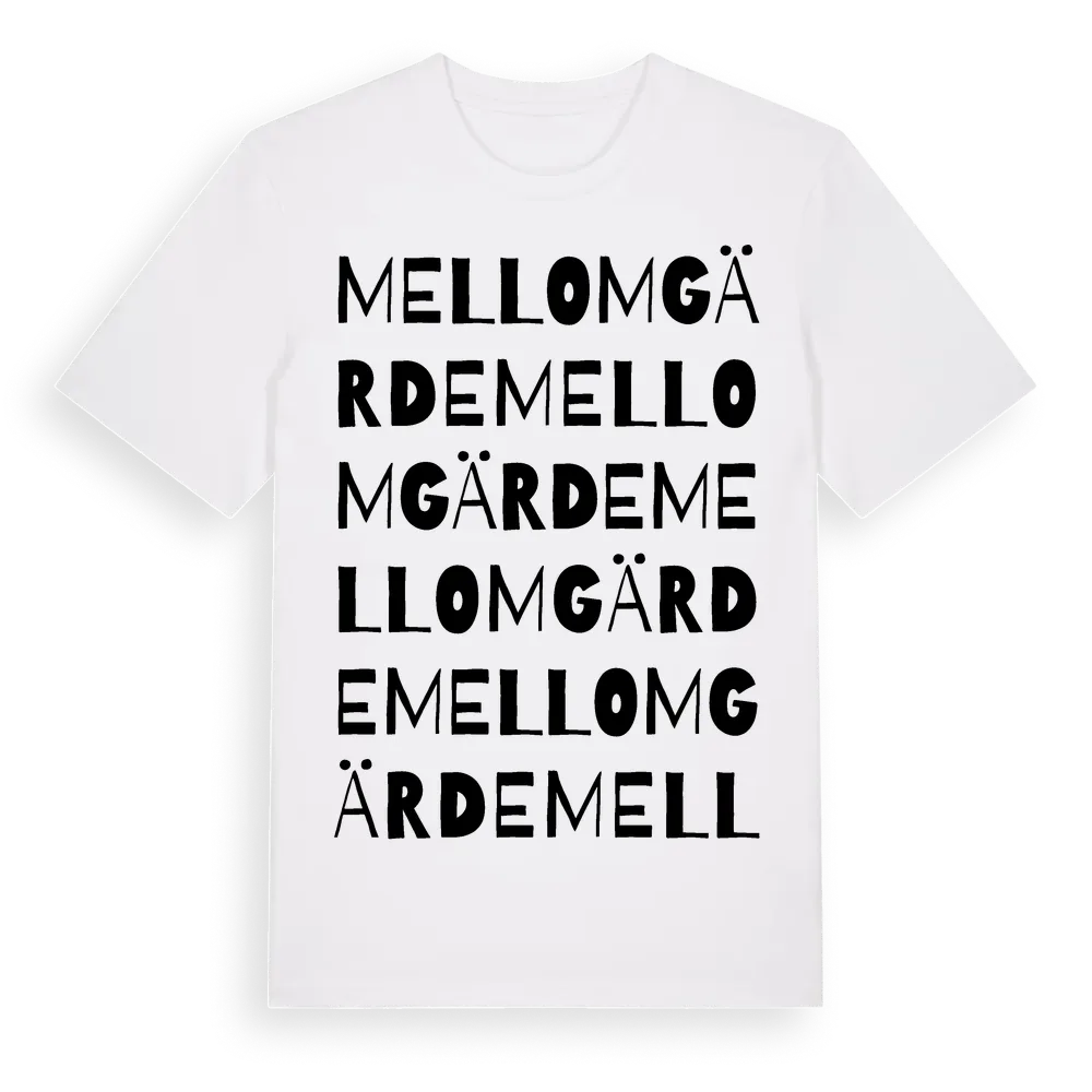 Mellomgärde ordlek t-shirt är inspirerad av Mellomgärde i Västra Götalands län, Sverige. Tröjan är designad för dig som har en speciell koppling till platsen – oavsett om du bor här, har rötterna här eller bara älskar Mellomgärde.