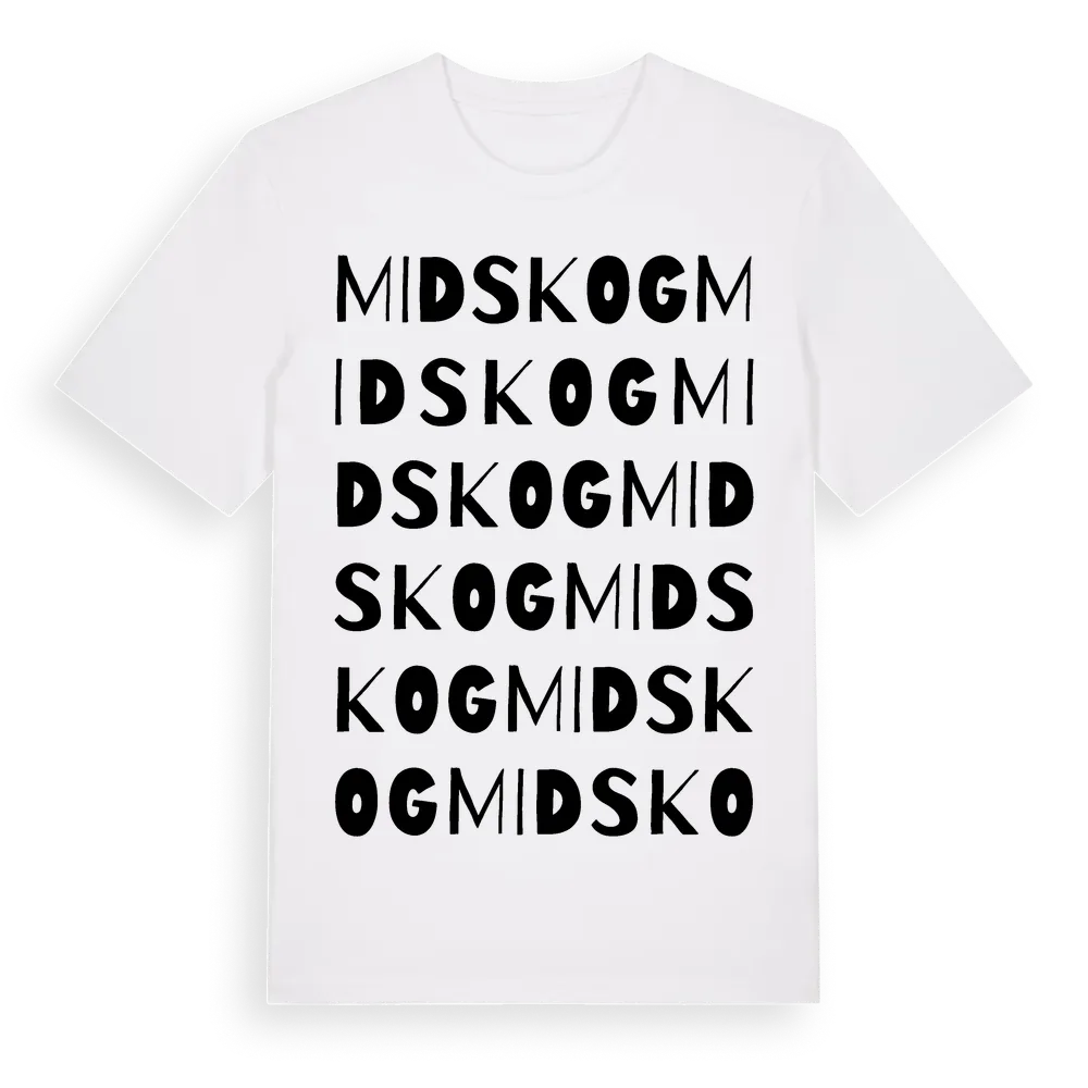 Midskog ordlek t-shirt är inspirerad av Midskog i Västra Götalands län, Sverige. Tröjan är designad för dig som har en speciell koppling till platsen – oavsett om du bor här, har rötterna här eller bara älskar Midskog.