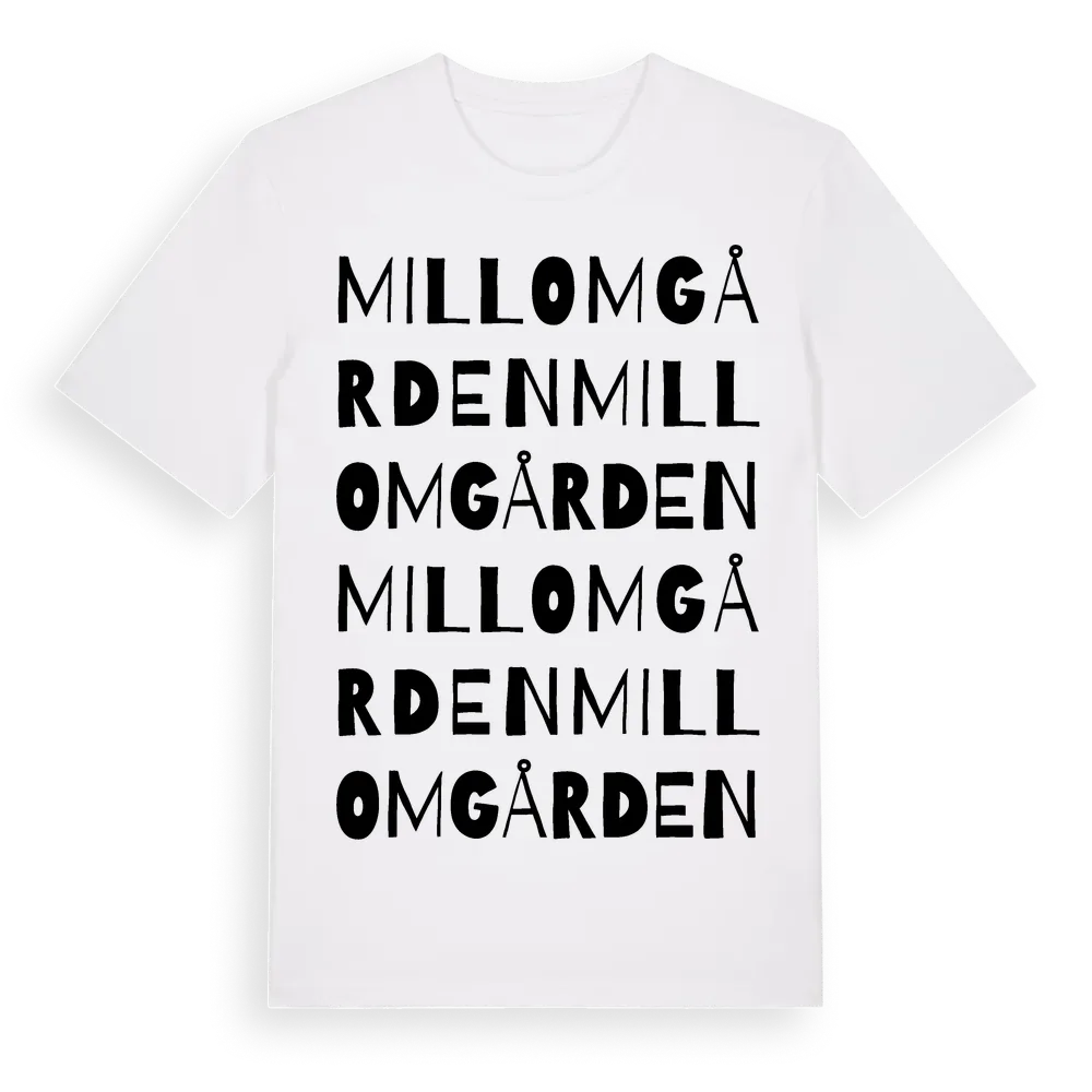 Millomgården ordlek t-shirt är inspirerad av Millomgården i Västra Götalands län, Sverige. Tröjan är designad för dig som har en speciell koppling till platsen – oavsett om du bor här, har rötterna här eller bara älskar Millomgården.