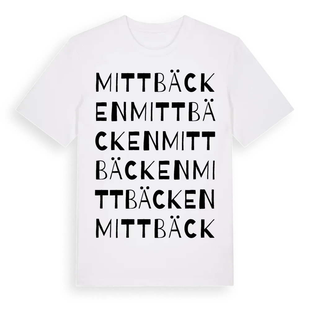 Mittbäcken ordlek t-shirt är inspirerad av Mittbäcken i Västra Götalands län, Sverige. Tröjan är designad för dig som har en speciell koppling till platsen – oavsett om du bor här, har rötterna här eller bara älskar Mittbäcken.