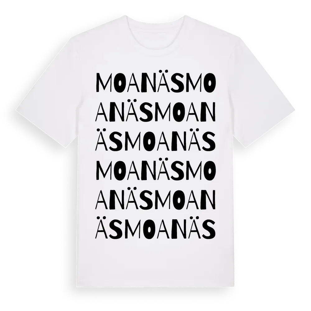 Moanäs ordlek t-shirt är inspirerad av Moanäs i Västra Götalands län, Sverige. Tröjan är designad för dig som har en speciell koppling till platsen – oavsett om du bor här, har rötterna här eller bara älskar Moanäs.