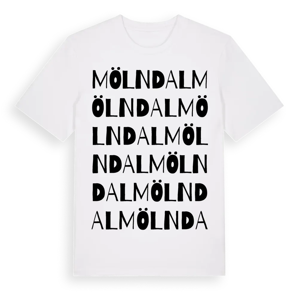 Mölndal ordlek t-shirt är inspirerad av staden Mölndal i Västra Götalands län, Sverige. Tröjan är designad för dig som har en speciell koppling till platsen – oavsett om du bor här, har rötterna här eller bara älskar Mölndal.