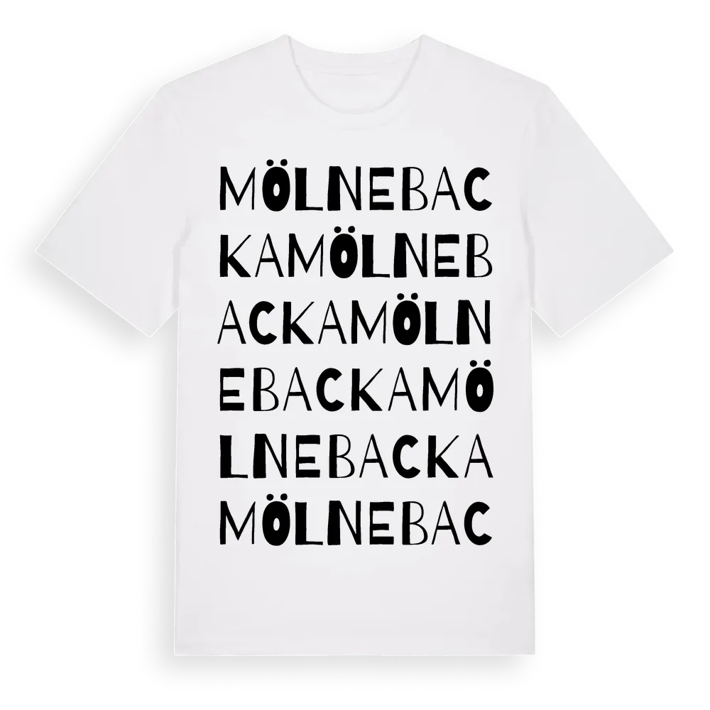 Mölnebacka ordlek t-shirt är inspirerad av Mölnebacka i Västra Götalands län, Sverige. Tröjan är designad för dig som har en speciell koppling till platsen – oavsett om du bor här, har rötterna här eller bara älskar Mölnebacka.