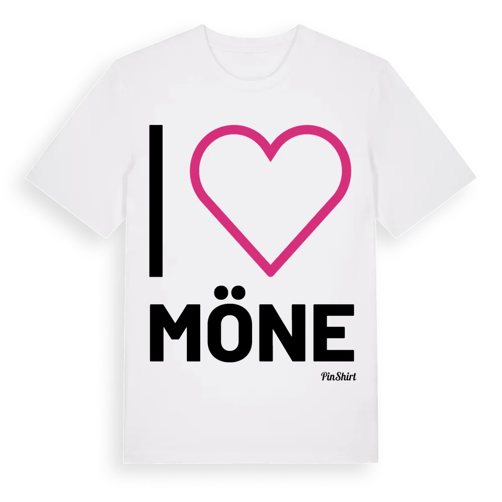 Det klassiska "I ❤ Möne"-motivet i stort format som täcker hela bröstet. För dig som vill visa kärleken till Möne på riktigt. Premium bomull, unisex – från byn Möne i Västra Götalands län.