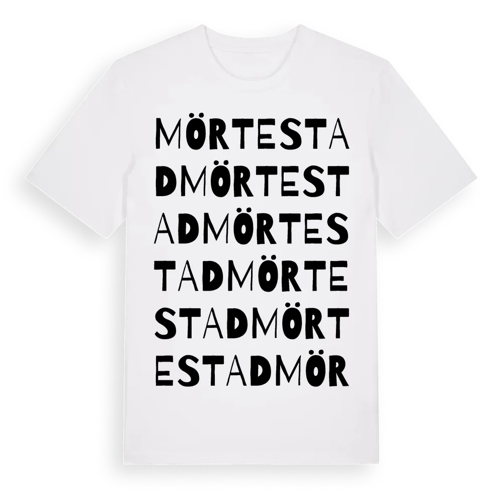 Mörtestad ordlek t-shirt är inspirerad av byn Mörtestad i Västra Götalands län, Sverige. Tröjan är designad för dig som har en speciell koppling till platsen – oavsett om du bor här, har rötterna här eller bara älskar Mörtestad.